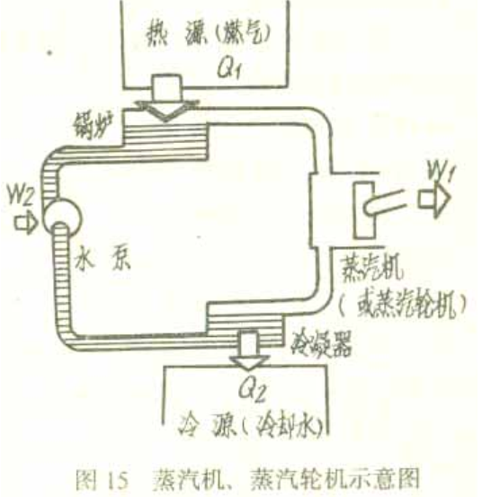圖15是十八世紀(jì)末才趨于完善的人類發(fā)明創(chuàng)造的第一種熱機(jī)——蒸汽機(jī)的示意圖。煤或其它燃料,在鍋爐中燃燒后產(chǎn)生高溫燃?xì)鈧鳠峤o水,獲得具有一定壓力和溫度的蒸汽。蒸汽進(jìn)入氣缸,在膨脹過程中,推動(dòng)活塞,再通過連桿、轉(zhuǎn)動(dòng)曲柄軸,輸出機(jī)械功。膨脹后蒸汽的壓力和溫度降低,在冷凝器中凝結(jié)成水,再用水泵打回到鍋爐中。這樣構(gòu)成了可以不斷重復(fù)進(jìn)行的循環(huán)過程,稱為熱力學(xué)循環(huán)。水或蒸汽在蒸汽機(jī)裝置中,經(jīng)過高溫燃?xì)鈱?duì)它傳熱(Q)后,內(nèi)能升高了。當(dāng)它從高壓向低壓膨脹時(shí),內(nèi)能降低而對(duì)活塞輸出機(jī)械功(W)。水或蒸汽是蒸汽機(jī)使用的工作介質(zhì),叫做工質(zhì)。我們把工質(zhì)作為體系,如果考慮它進(jìn)行了一個(gè)熱力學(xué)循環(huán),回到原來的狀態(tài),內(nèi)能沒有變化(即△E=O),則W=W-W=Q=Q-Q這就是說,蒸汽機(jī)活塞的輸出功減去輸給水泵的功,恰好等于從燃?xì)鈧鹘o工質(zhì)的熱量減去工質(zhì)傳給冷卻水的熱量。