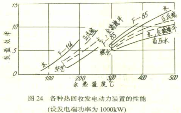 工業(yè)余能的利用,是個(gè)大問題。我國工業(yè)耗能約占全國總能耗的三分之二,而利用效率低,大量余能白白丟掉了,今后應(yīng)該好好利用起來。余能利用的辦法與它的品位很有關(guān)系,前面介紹熱力學(xué)第二定律,已經(jīng)提到能源品位的高低對(duì)熱機(jī)熱效率的影響。例如有高溫的廢氣,溫度甚至高到1000℃以上,如果氣體壓力也比較高,那就很好利用,把它通過一個(gè)膨脹氣輪機(jī)(例如煙氣輪機(jī)),高溫高壓的氣體就可以膨脹作功。高爐煤氣、焦?fàn)t煤氣、化工工業(yè)中都有兩個(gè)大氣壓上下的高溫氣體,過去是浪費(fèi)掉了,現(xiàn)在裝上一個(gè)煙氣輪機(jī),就可以很好利用這個(gè)能量了。但是如果高溫氣體壓力只是略大于大氣壓,就不能膨脹作功,只能作為一個(gè)熱源來使用,用在封閉式的氣輪機(jī)上,或者用來產(chǎn)生蒸汽通過汽輪機(jī)發(fā)電。假如余氣的溫度低,只有300℃左右,則需應(yīng)用有機(jī)工質(zhì)的蒸汽循環(huán)(圖24),勉強(qiáng)還可以使用。從熱力學(xué)第二定律就可以看出熱效率會(huì)很低(目前不會(huì)超過8%),而設(shè)備投資比較大,回收投資的年數(shù)也就多了。要比較用熱機(jī)來發(fā)電,還是用來產(chǎn)生工業(yè)上或者生活供暖上所需要的低溫蒸汽,或熱水那一個(gè)更為合算。