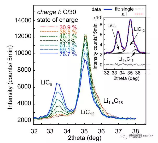 下圖為在第二個充電周期內(nèi),C/30倍率充電時不同SoC下負極的物相變化,可以看到在30.9%SoC時,負極的物相主要為LiC12、Li1-XC18和少量的LiC6組成,在SoC超過46%后,LiC12的衍射強度持續(xù)降低,而LiC6的強度則不斷增強。但是即便最后完成充電,由于低溫下僅充電1503mAh(常溫容量1950mAh),因此LiC12在負極中持續(xù)存在。如果將充電電流降到C/100,則該電池在低溫下仍然能夠獲得1950mAh容量,這表明低溫下鋰離子電池的容量降低主要是因為動力學(xué)條件變差造成的。