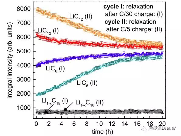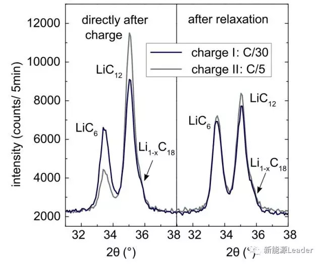 下圖為充電后和擱置20h后石墨負極的物相結(jié)構(gòu)圖,可以看到在剛剛充電結(jié)束時,兩種充電倍率下,石墨負極的物相有很大的區(qū)別。C/5大倍率下,石墨負極中LiC12的比例較高,LiC6的比例較低,但是在靜置20h后,兩者之間的區(qū)別已經(jīng)變的非常小。