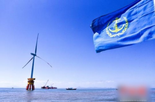 11月1日,在浙江舟山海事局“海巡0745”艇的警戒護航下,浙江首臺海上風機——國電舟山普陀6號海上風電場項目主體工程第一臺風機被順利安裝到風機承臺上。