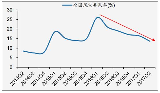 2015年的全國新增風電裝機32GW,使得2016年1季度全國棄風 率的平均水平到達26%,裝機量和棄風率都創歷史新高,而后企業新增裝機的動力降低。隨著限電的改善和運營商盈利的好轉,再加上降電價等多種因素的刺激,新增裝機有望提升。2017年上半年全國限電率為14%,持續獲得改善。限電的持續下降有望推動裝機的提升