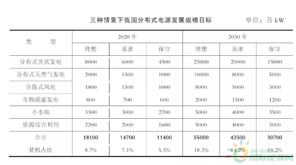 根據(jù)國(guó)家《能源發(fā)展“十三五”規(guī)劃》《2014—2020 年能源行動(dòng)計(jì)劃》《可再生能源發(fā)展“十三五”規(guī)劃》《電力發(fā)展“十三五”規(guī)劃》相關(guān)內(nèi)容,2020 年分布式光伏發(fā)電、分布式天然氣發(fā)電開發(fā)規(guī)模達(dá)到國(guó)家規(guī)劃目標(biāo),2030 年分布式光伏發(fā)電、分布式天然氣發(fā)電開發(fā)規(guī)模應(yīng)滿足實(shí)現(xiàn)國(guó)家戰(zhàn)略目標(biāo)的要求;分散式風(fēng)電、生物質(zhì)能發(fā)電、小水電和資源綜合利用開發(fā)規(guī)模達(dá)到相關(guān)規(guī)劃或資源量約束目標(biāo)。
