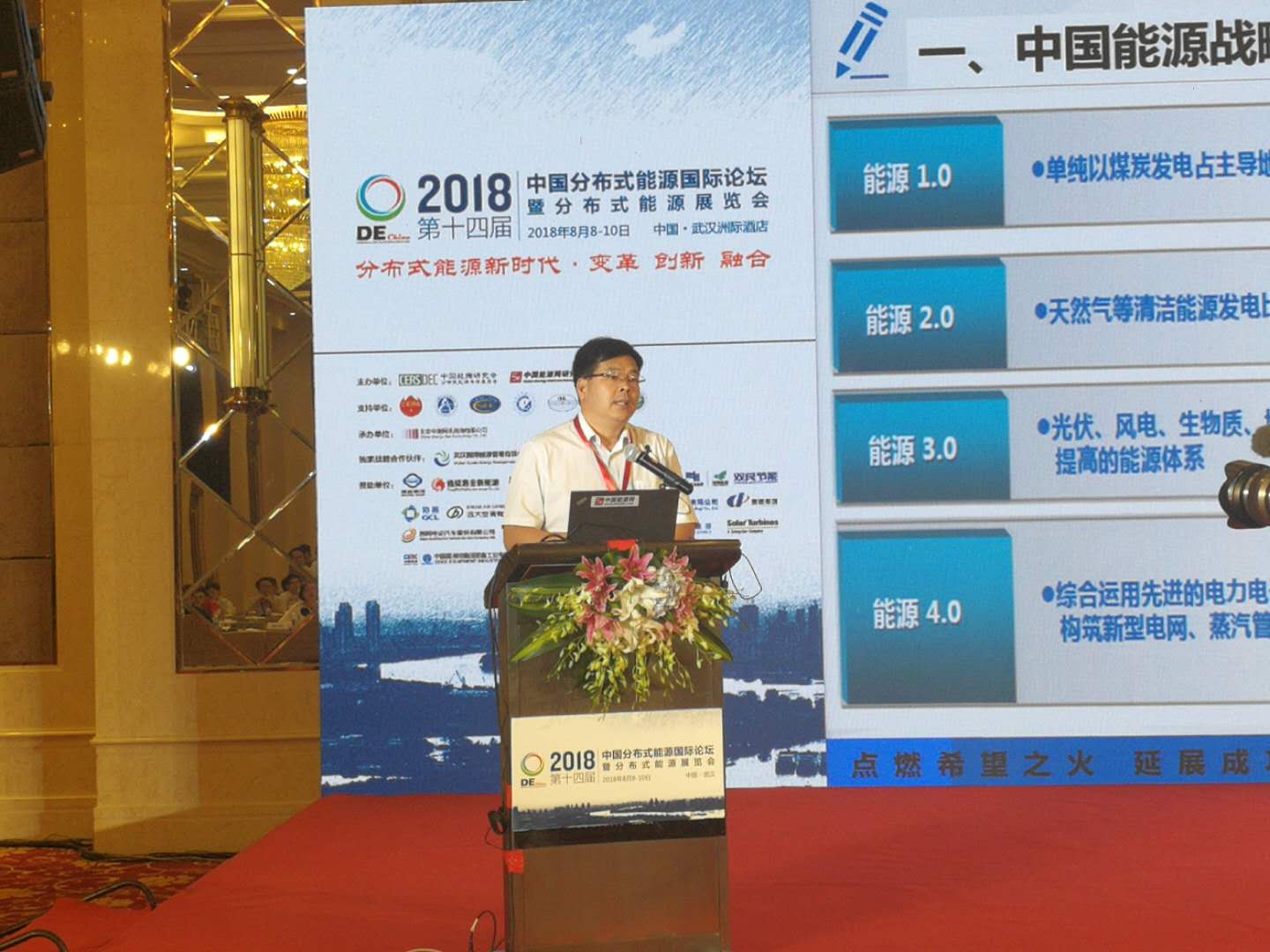 綦安訓:當前傳統能源產能嚴重過剩,限制傳統能源上新項目,天然氣用不起,將改革價格形成機制。中國讓你干,一剎車死一片。黃色的大家可以看到,國內外專家從去年到現在做的研判,中美貿易戰非常難受。最上面大家可以看到,我們對未來的能源判斷,能源轉型新時代倒逼進入整合信息技術與分布式可再生能源的能源4.0時代。如果沒有這個判斷,我們就不用開這個會了,我們認為第十四屆中國分布式能源國際論壇,包括它的主題詞變革和融合都很重要。
