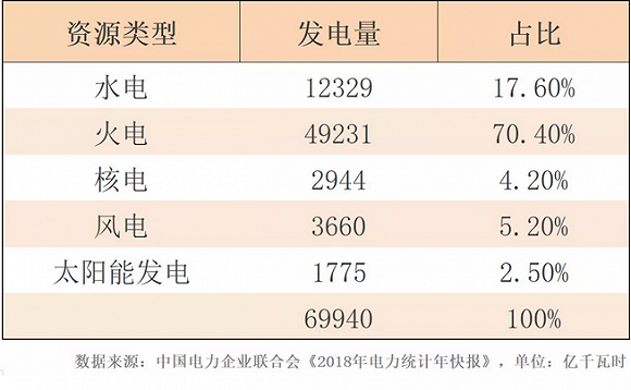 目前,我國風電、光伏在電力結構中仍只占據較小的比重。2018年,全國風電、光伏發電量分別為3660億千瓦時、1775億千瓦時,占據全部發電量的5.2%、2.5%。