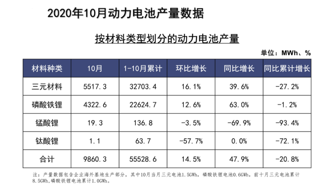 點評:從以上數據可以看出,10月份,磷酸鐵鋰電池無論是從產量還是動力電池裝機量上看,表現都十分搶眼:產量4.3GWh,同比增長63%,三元電池產量5.5GWh,同比增長39.6%;共計裝車2.4GWh,同比上升127.5%,三元電池共計裝車3.4GWh,同比上升15.7%。