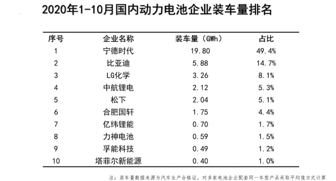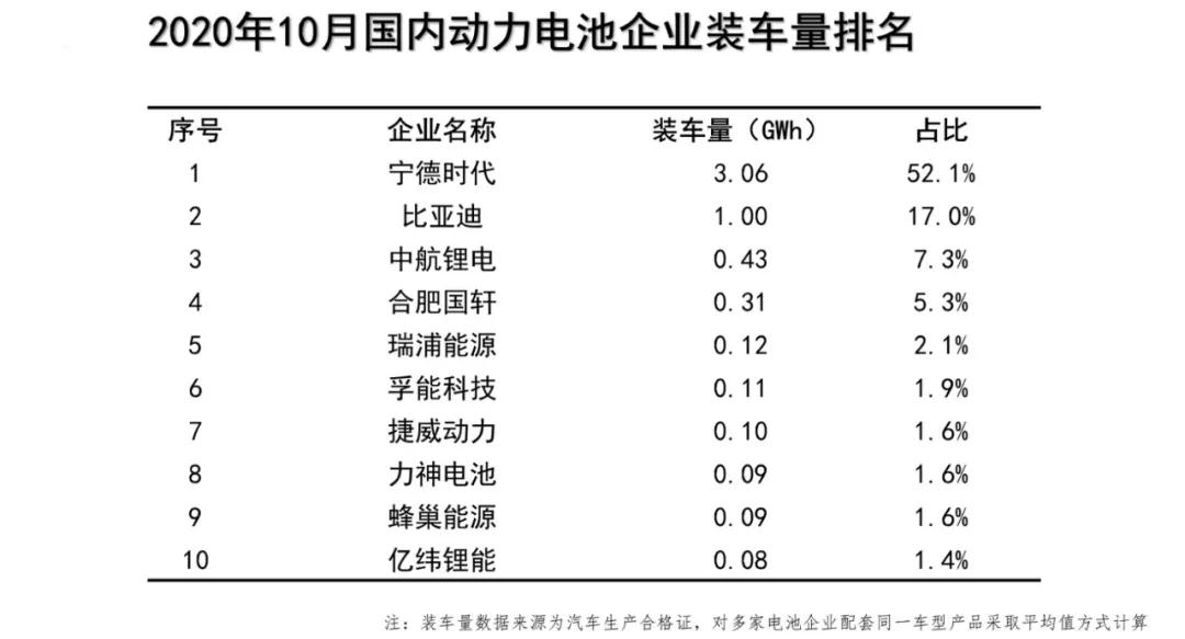 企業方面,2020年10月,我國新能源汽車市場共計38家動力電池企業實現裝車配套。排名前3家、前5家、前10家動力電池企業動力電池裝車量分別為4.5GWh、4.9GWh和5.4GWh,占總裝車量比分別為76.5%、83.9%和92%。