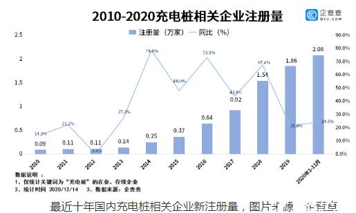 從相關(guān)數(shù)據(jù)上可以明顯看出,最近幾年來,國內(nèi)與充電樁相關(guān)的企業(yè)注冊量一直呈現(xiàn)快速增長的態(tài)勢,2016年相關(guān)企業(yè)注冊量只有0.64萬家,2018年的新注冊量突破萬家,達(dá)到1.54萬家,2019年注冊量為1.86萬家。到了2020年,僅是前十一個月,國內(nèi)充電樁相關(guān)的企業(yè)就新注冊了2.08萬家。