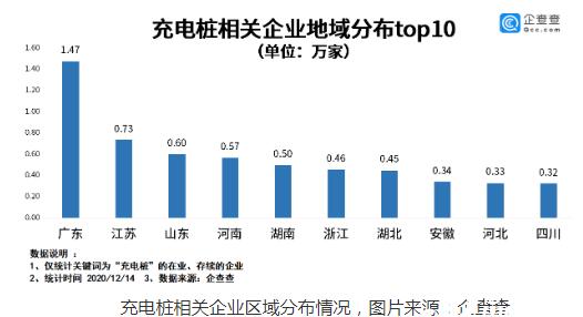 從分布地區(qū)看,廣東可謂是國內(nèi)充電樁相關(guān)企業(yè)的大省,截至目前,廣東省共有1.47萬家相關(guān)企業(yè)。排名第二的是江蘇省,不過與廣東省相比,江蘇省的充電樁相關(guān)企業(yè)數(shù)量要少一半,有0.73萬家。此外,山東、河南、湖南也都是充電樁相關(guān)企業(yè)的聚集地,區(qū)域內(nèi)的相關(guān)企業(yè)都超過了5000千家。