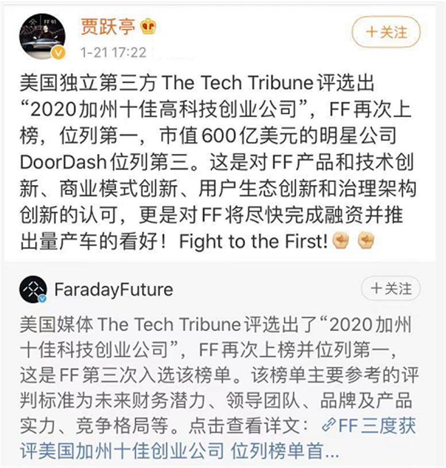 1月21日,賈躍亭發微博稱,FF獲得了由The Tech Tribune評選出了“2020加州十佳科技創業公司”,并且名列榜首。這是對FF產品和技術創新、商業模式創新、用戶生態創新和治理架構創新的認可,更是對FF將盡快完成融資并推出量產車的看好。