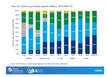預計美國2020年新增發電中太陽能(深藍色)占比將達到43%。圖片來源:SEIA