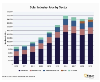 2016年之后,美國光伏產業就業人數總體不斷下降,僅2019短暫回升。來源:Solar Foundation