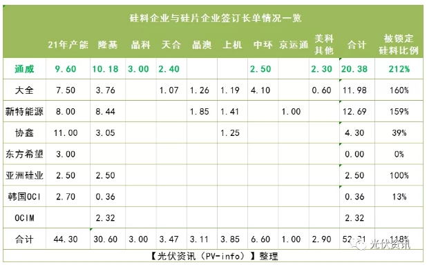 根據公開資料顯示,截至2020年底,大全新能源硅料產能達7萬噸,2021大全7.5萬噸硅料產能產能已被隆基、天合、晶澳、上機數控、中環等鎖定;新特2020年底硅料產能達7.2萬噸,2021年隆基、晶澳、上機數控共鎖定新特11.69萬噸硅料產能,遠超其實際產能8萬噸;東方希望硅料產能2021年預計產能3萬噸;亞洲硅業2021年的2.5萬噸硅料將全部供應給隆基;2021年協鑫4.51萬噸硅料產能已被上機數控、隆基股份、中環股份三家聯合鎖定,實際產能11萬噸。