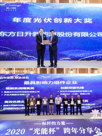 3月3日,2020年度“光能杯”分享會(huì)暨頒獎(jiǎng)典禮在蘇州隆重舉行,東方日升新能源股份有限公司(簡稱“東方日升”)擷取了“年度光伏創(chuàng)新大獎(jiǎng)”,以及由索比光伏網(wǎng)和鑒衡認(rèn)證聯(lián)合頒發(fā)的“最具影響力光伏組件企業(yè)——創(chuàng)新突破先鋒獎(jiǎng)”,企業(yè)實(shí)力再獲行業(yè)認(rèn)可。