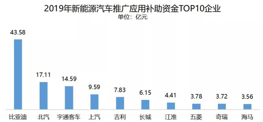 比亞迪以43.58億元,成為當年應補助資金最多的新能源汽車生產品牌,該筆資金包括2家比亞迪系的主機廠:比亞迪汽車有限公司和比亞迪汽車工業有限公司。