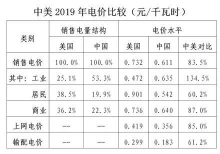 從銷(xiāo)售電價(jià)看,2019年,我國(guó)銷(xiāo)售電價(jià)平均每千瓦時(shí)0.611元,低于美國(guó)的0.732元。在用戶類(lèi)別結(jié)構(gòu)上,美國(guó)是典型發(fā)達(dá)國(guó)家,居民用電占比大、價(jià)格高,工業(yè)用電占比小、價(jià)格低。我國(guó)通過(guò)工商業(yè)用電補(bǔ)貼居民、農(nóng)業(yè)用電,表現(xiàn)為工業(yè)用電占比大、價(jià)格高,居民農(nóng)業(yè)用電占比小、價(jià)格低。在地區(qū)結(jié)構(gòu)上,兩國(guó)均存在顯著的地區(qū)差異。美國(guó)高價(jià)地區(qū)主要為夏威夷等海島以及紐約、加州等沿海發(fā)達(dá)地區(qū),價(jià)格水平高于我國(guó)浙江、江蘇等東部省份。美國(guó)低價(jià)地區(qū)主要是中部地區(qū),平均電價(jià)高于我國(guó)青海、新疆等西部省份,但工業(yè)電價(jià)低于我國(guó)西部省份。