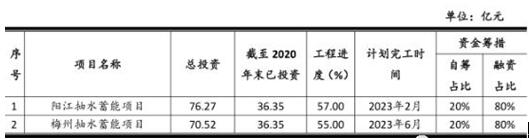 陽江抽水蓄能電站位于廣東省陽江市陽春市八甲鎮境內。該項目規劃裝機容量 2400MW(6×400MW),分兩期建設,其中近期裝機容量 1200MW(3×400MW),遠期工程根據電力市場的發展情況適時建設。電站上、下水庫、進出水口按裝機容量 2400MW 在近期一次建成。陽江抽水蓄能電站屬國內最高水頭、單機容量國內最高的純抽水蓄能電站,肩負著電力系統調峰填谷、調頻調相、旋轉備用以及緊急事故備用任務,改善系統內包括西電電源的運行條件,優化電源結構,減少系統總費用,并為系統安全穩定運行提供有力保障,是廣東電網經濟的調峰電源。項目預計總投 762,737.93 萬元,其中資本金占總投資的 20%,其他采取銀行長期款。截至 2020 年末,項目資本金已到位 107,274.27 萬元,項目已有融資金額 256,223.51 萬元。項目于 2015 年 11 月正式開工建設,目前建設按計劃穩步推進,預計 2022 年 6 月首臺機組投產發電,2023 年 2 月項目建成投產。