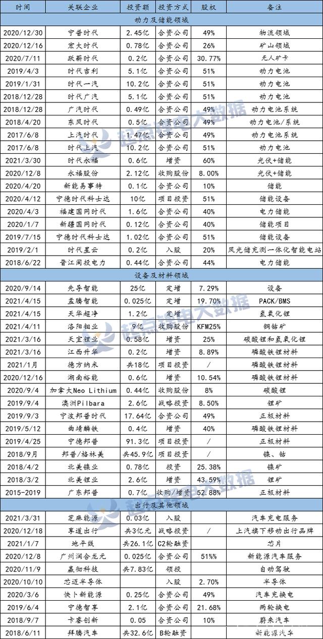 據起點鋰電大數據統計,2018年以來,寧德時代對外投資及合資成立的企業超過45家,設立的全資子公司超過10家,這些企業分布在動力電池、儲能、鋰電池材料、鋰電池智能裝備制造、充換電、自動駕駛、新能源汽車、乃至芯片、半導體等多個領域。算上在各領域的項目投資,寧德時代投資帝國已砸入超2000億元。