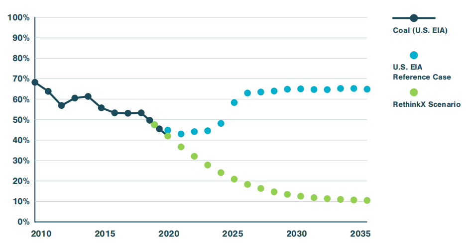 塞巴說,“新的太陽能或風力發電裝置的總成本已經低于天然氣、煤炭和核能等傳統發電的運營成本。意味著,即使建造傳統的發電裝置不需要任何成本,但僅從運營成本來看,仍然比太陽能或風力發電裝置昂貴。” “然而,不現實但很容易糾正電力的平準化成本可能繼續推動對傳統電力的投資。一旦錯誤的LCOE成本和實際的平準化成本之間的差異變得無法否認,金融市場將迅速發展,養老金、退休和捐贈基金的數萬億投資可能變得一文不值。這方面的一個例子就是,美國煤碳(股票等的)市值中所反映的美國道瓊斯美國煤炭指數,坍塌99%,從2011年的高點500跌到2020年的5,此時該指數本身被標準普爾全球悄然停止。