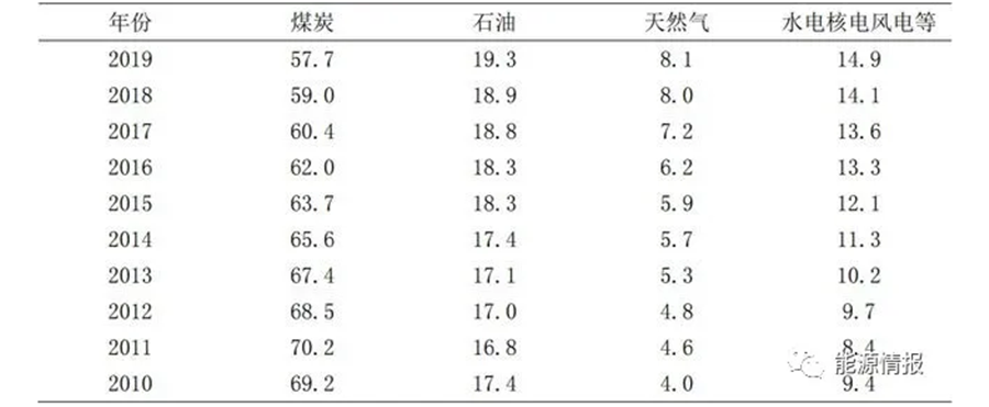 我國的資源稟賦一直是“富煤缺油少氣”。根據國家統計局數據,2019 年,中國煤炭消費占能源消費總量的 57.7%;水電、核電、風電等可再生能源消耗占比 14.9%,詳見表 1。從 發展趨勢來看,中國能源結構呈現多元化趨勢,其中低碳能源的份額逐漸增加。總體上,盡 管清潔能源消費占比持續提升,但煤炭在未來很長一段時間內仍將處于主體性地位,“碳中 和”目標的實現仍將面臨巨大挑戰。