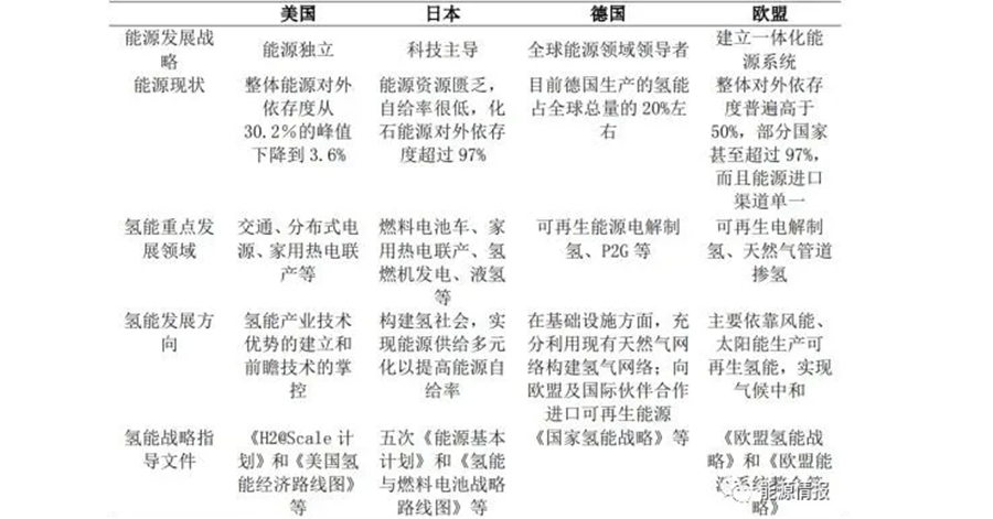 隨著全球能源消費結構向低碳轉型的加速,氫能作為一種清潔的二次能源再次受到各方關注。日本、美國、歐盟、韓國等國家和地區逐步明確了氫能在國家能源體系中的戰略地位,制定了與氫能相關的多元化政策,并結合自身的資源稟賦和產業技術現狀,引導其氫能產業健康發展,詳見圖6。