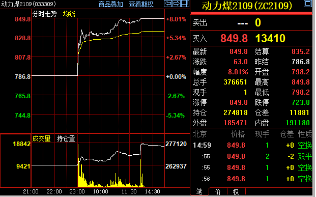 “漲停了,漲停了”。5月6日,勞動節后上班第一天,動力煤和焦煤市場交易一片火爆景象。在動力煤期貨市場上,各期限合約紛紛上漲,主力合約價格達到了849.8元/噸,尾盤漲幅突破8%,刷新歷史高點。