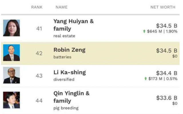 據《福布斯》全球富豪榜截至5月3日數據,動力電池巨頭寧德時代董事長曾毓群排名升至全球第42名。通過瑞廷時代持有寧德時代近25%的股份,曾毓群身價達345億美元,個人財富一度超過李兆基(321億美元)和李嘉誠(344億美元),問鼎香港首富。
