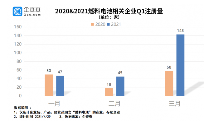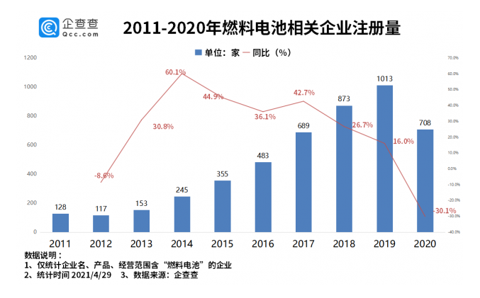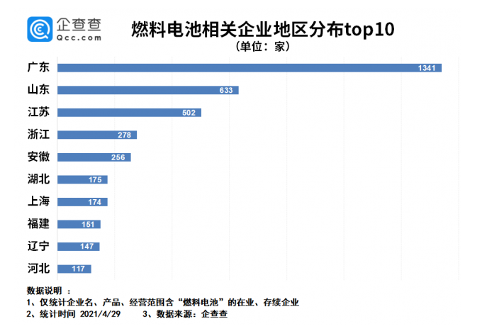 隨著燃料電池汽車商業化不斷推進,具有零排放、高效率、長續航等顯著優勢的燃料電池投資規模在持續擴大。企查查數據顯示,目前我國共有4900余家燃料電池企業,2020年新注冊企業708家,同比下降30.1%,今年一季度新注冊235家,同比增長86.5%。從地區分布來看,廣東以1341家企業位居第一,山東、江蘇分列二三名。