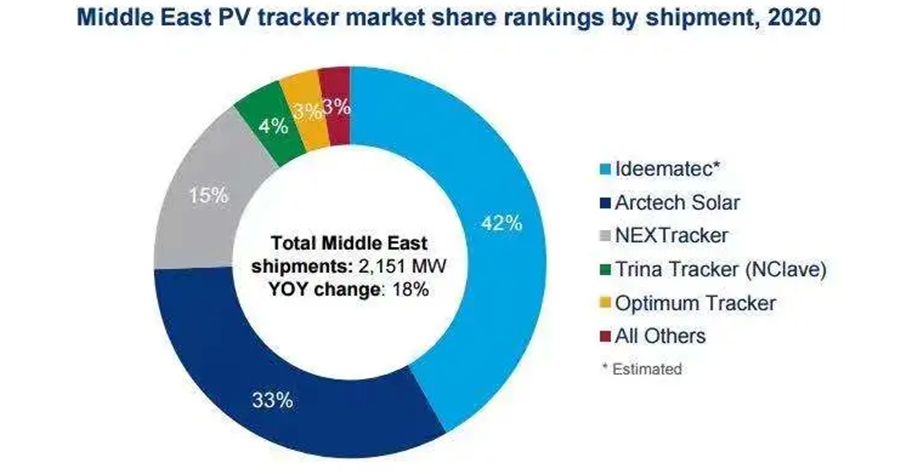 中東市場在2020年總計有2.15GW的光伏跟蹤支架出貨,Ideematec和中信博分別以42%(估算數(shù)據(jù))和33%的市場占比排在前兩位。NEXTracker以15%的市場占比排在第三位。