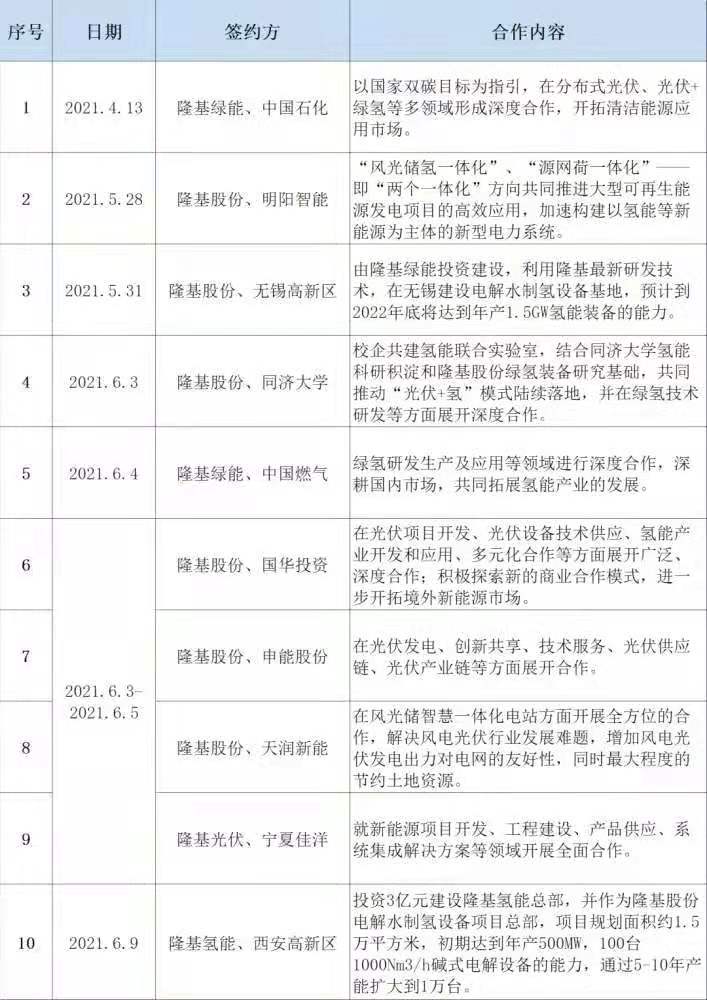 自今年4月份起,隆基股份已連續簽約10個氫能項目,具體如下: