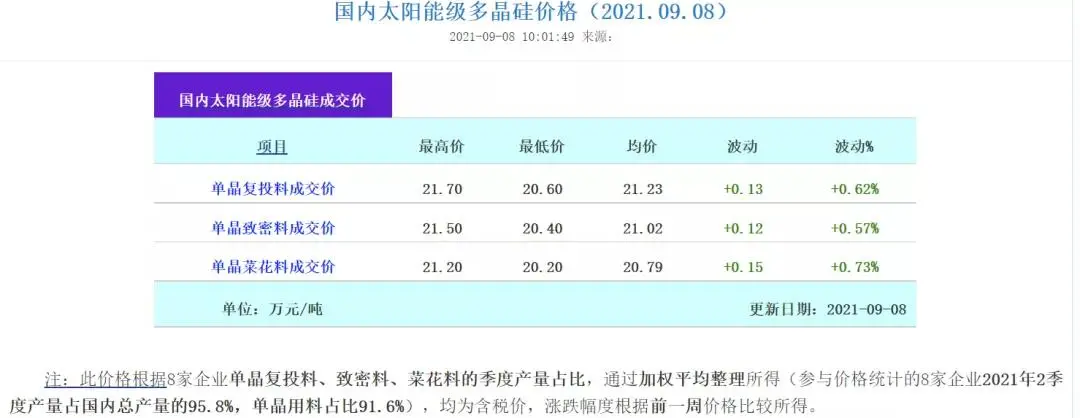 9月8日,硅業分會發布多晶硅最新價格信息,本周最新單晶復投料成交價格在20.6-21.7萬元/噸,均價21.23萬元/噸,較上周上漲0.13萬元/噸 ;單晶致密料成交價格區間在20.4-21.5萬元/噸,均價21.02萬元/噸,較上周上漲0.12萬元/噸 ;單晶菜花料成交價格區間在20.2-21.2萬元/噸,均價20.79萬元/噸,較上周上漲0.15萬元/噸。