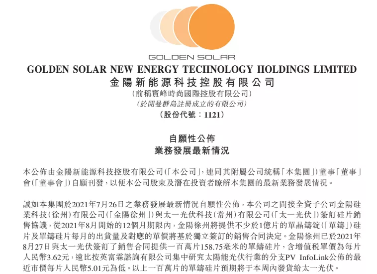 公告稱,公司間接全資子公司金陽硅業(yè)科技(徐州)有限公司(以下簡稱"金陽徐州")與太一光伏科技(常州)有限公司(以下簡稱"太一光伏")簽訂硅片銷售協(xié)議,從2021年8月開始的12個(gè)月期限內(nèi),金陽徐州將提供不少于1億片的單晶鑄錠("單鑄")硅片及單鑄硅片每月的出貨量及對應(yīng)的單價(jià)將基于獨(dú)立簽訂的銷售合同決定。