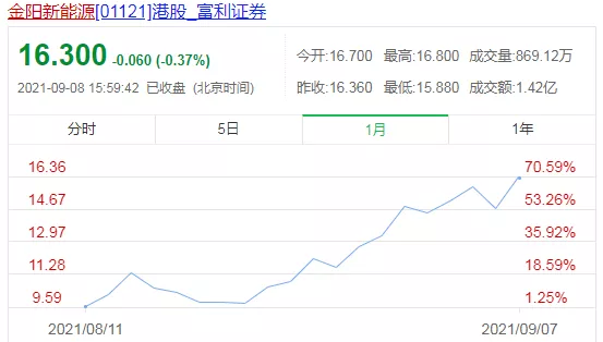 從7月28日更名為金陽新能源至今,其股價(jià)已從每股5.0港元上漲至9月8日收盤后的16.30港元,不到兩個(gè)月時(shí)間漲幅就高達(dá)226%。