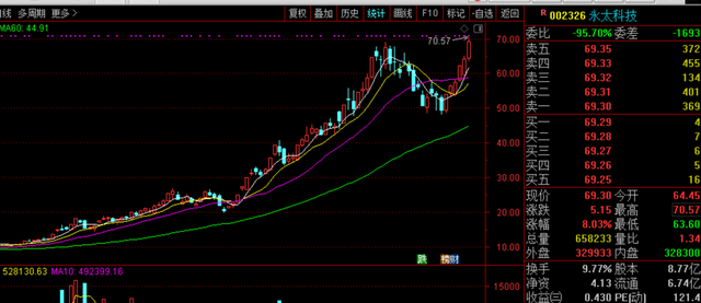 今年4月,永太科技股價(jià)由8元左右起步,漲至如今的70元,漲幅達(dá)到720%,半年多就翻了8倍,市值也由當(dāng)初的70多億,增至如今的607億,暴增530億。