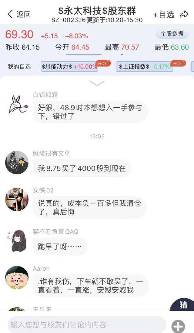 在尺度APP的永太科技股東群,不少投資者分享重倉(cāng)永太科技巨額收益的喜劇,“永太科技真是從來(lái)沒(méi)有人讓人失望過(guò)。”但也有投資者擔(dān)憂漲幅過(guò)大,過(guò)早地下了車(chē),而錯(cuò)失這次財(cái)富倍增機(jī)會(huì)。