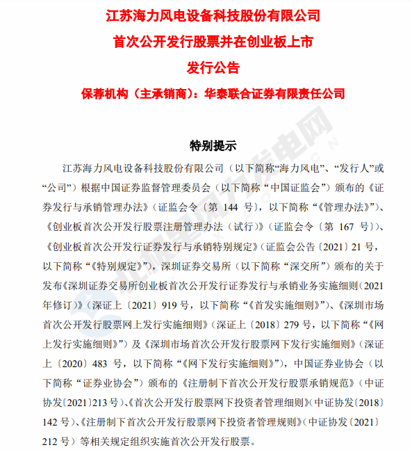 11月11日,江蘇海力風(fēng)電設(shè)備科技股份有限公司(以下簡(jiǎn)稱“海力風(fēng)電”)發(fā)布首次公開發(fā)行股票并在創(chuàng)業(yè)板上市發(fā)行公告,本次公開發(fā)行股票數(shù)量約為5435萬(wàn)股,發(fā)行價(jià)格為60.66元/股;2021年11月15日進(jìn)行網(wǎng)上、網(wǎng)下申購(gòu)。申購(gòu)簡(jiǎn)稱為海力風(fēng)電,申購(gòu)代碼為301155。