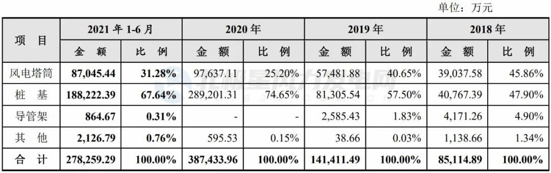 2021年半年報(bào)顯示,海力風(fēng)電的主營(yíng)業(yè)務(wù)為樁基、海上風(fēng)電塔筒、其他業(yè)務(wù)、其他、陸上風(fēng)電塔筒,占營(yíng)收比例分別為:66.39%、30.06%、1.85%、0.75%、0.64%。報(bào)告期內(nèi),主要產(chǎn)品的銷售收入及占比情況如下: