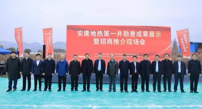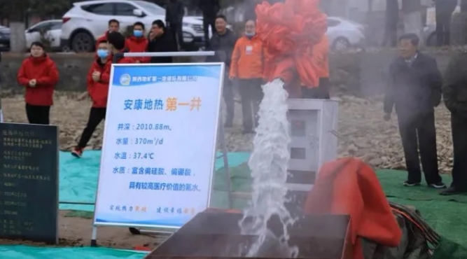 2021年12月14日,陜西省安康市第一口地熱井在恒口示范區高儉村出水,井深2010.88m,井口水溫37.4℃,24小時穩定流量370m/d。這是安康市礦產資源開發的重大喜訊和重大突破。安康市自然資源局和恒口示范區管委會聯合舉行勘查成果發布會。
