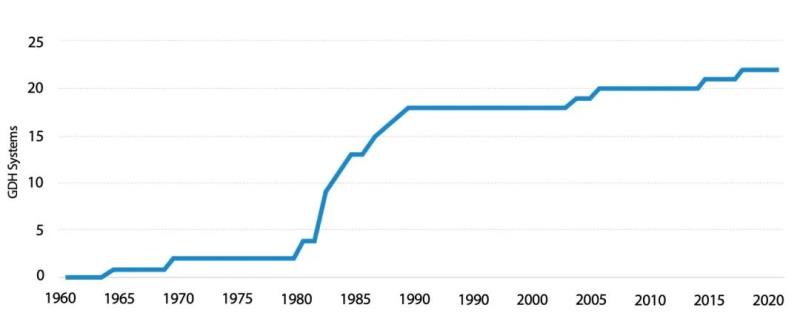 在美國,地熱區域供暖項目最初是在高品位水熱型地熱資源附近開發的,但該技術正在向中-低品位水熱型地熱資源地區擴展。目前,美國共有23個地熱區域供熱系統,總容量超過75MWth。