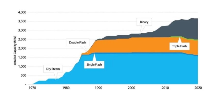 目前美國共有93個地熱發電站,總裝機容量為3673MW。近年來,美國地熱發電裝機量增長緩慢,根據統計,從2015年至2019年期間,美國新增了7個地熱發電站,總裝機容量186MW,但同期11個地熱電站退役,總裝機容量103MW。