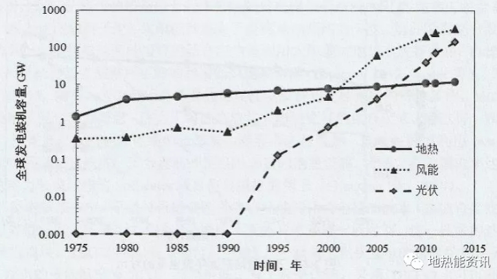 圖1 地?zé)帷L(fēng)力和太陽(yáng)能發(fā)電進(jìn)程對(duì)比(據(jù)李克文)