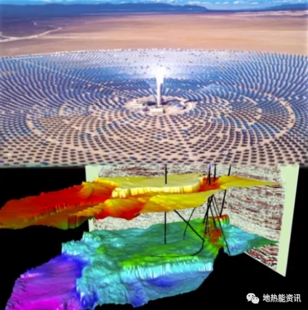 2020年世界地?zé)岽髸?huì)有論文提出了地下儲(chǔ)熱超超臨界發(fā)電的研究設(shè)想(圖2)。計(jì)劃利用廣大地面的太陽(yáng)能集熱(如太陽(yáng)能熱發(fā)電),將聚熱塔收集的高熱不是當(dāng)即用于發(fā)電,而是將高熱儲(chǔ)存到地下熱儲(chǔ)。水的超臨界點(diǎn)是溫度374℃和壓力220巴,太陽(yáng)能聚熱溫度可高達(dá)600℃構(gòu)成超超臨界,這樣的高熱補(bǔ)充和增強(qiáng)了現(xiàn)有的高溫?zé)醿?chǔ),用來(lái)發(fā)電就比現(xiàn)有的地?zé)岚l(fā)電系統(tǒng)效率更大大提高了?,F(xiàn)有地?zé)崽锏牡叵聼醿?chǔ)是天然的,不需要干熱巖那樣靠壓裂來(lái)人造熱儲(chǔ)(太困難了);現(xiàn)有熱儲(chǔ)的溫度不夠高,就靠太陽(yáng)能聚熱來(lái)注入增溫。該設(shè)想已經(jīng)用數(shù)學(xué)模型擬合,是有可能實(shí)現(xiàn)的,這樣就增加了原顯不夠的地?zé)豳Y源,就可以充分發(fā)揮“地?zé)?”的效益了。