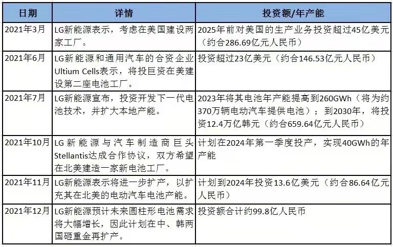 為縮小與寧德時代之間的差距、開拓新的市場布局,2021年以來,LG新能源在全球范圍內擴大其電池產能。