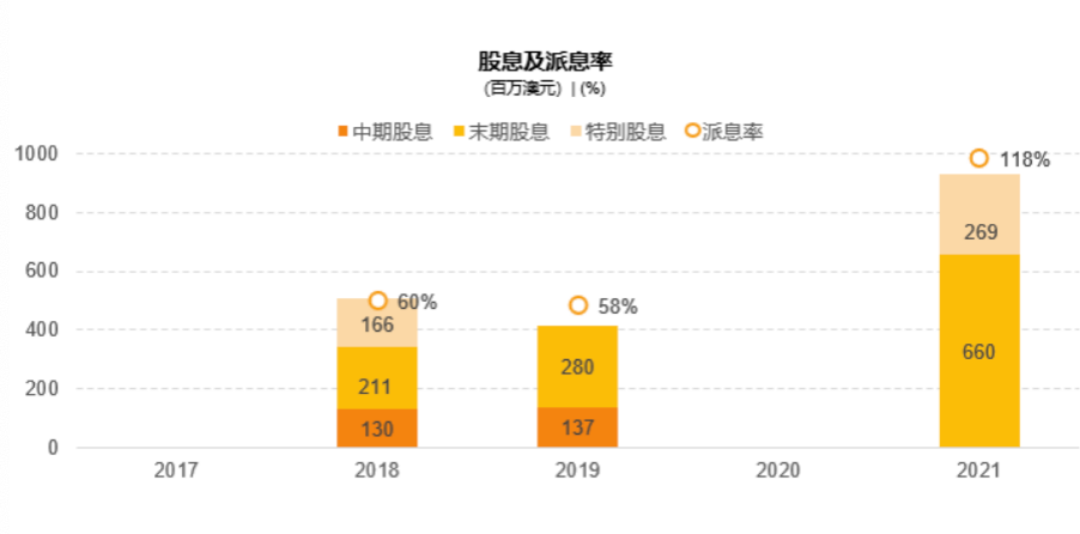 “履行社會責任、股東利益至上”,是兗煤澳洲上市以來始終秉持的理念。通過持續優化公司治理體系、強化市值管理、提高股東回報,兗煤澳洲在資本市場關注度和形象得到有效提升,利潤分配政策的連續性和穩定性得到保障。2021年公司將派發末期股息0.704澳元/股,派息金額9.3億澳元(折合42億元人民幣),派息率達118%,派息率和派息額為歷年來最高。