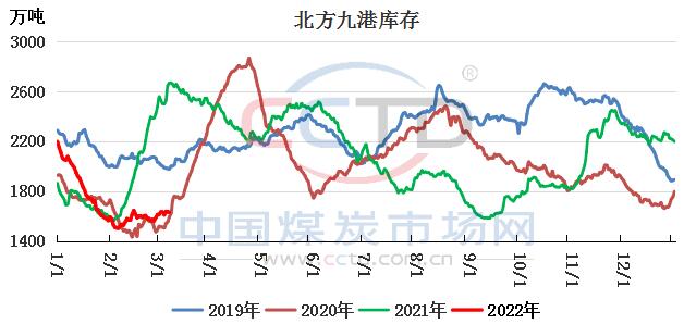 近期,隨著發(fā)運利潤空間不斷擴大,貿(mào)易商請車積極性大增,鐵路運量基本維持滿發(fā)狀態(tài)。呼鐵局批車保持在30大列以上,大秦線非天窗日運量保持在130萬噸以上,港口調(diào)入量增至歷史高位水平。在電廠長協(xié)采購積極,非電終端剛性采購需求增多下,港口調(diào)出量也增至較高水平。近日,港口進出量相對均衡,庫存雖有積累但提升較慢,截至3月8日,北方九港庫存1636.7萬噸,較月初小幅增加。