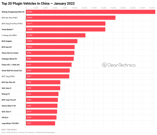 中國電動汽車市場的當前趨勢,在1月份的前5名中,以小型4座五菱MiniEV位居榜首,其次是比亞迪,然后是特斯拉ModelY和第五名的理想ONE。