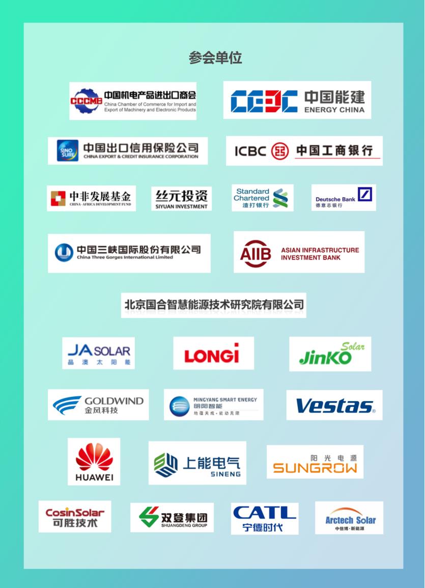 來自國家發改委、國務院國資委等部委,中國機電產品進出口商會等行業協會,中國出口信用保險公司、中國工商銀行、渣打銀行(中國)有限公司、德意志銀行、亞洲基礎設施投資銀行等金融和保險機構,中非發展基金、絲元投資有限責任公司(中非產能合作基金有限責任公司、中拉產能合作基金有限責任公司)、中國三峽國際股份有限公司等投資機構,晶澳太陽能科技股份有限公司、隆基綠能科技股份有限公司、晶科能源有限公司、新疆金風科技股份有限公司、明陽智慧能源集團股份有限公司、維斯塔斯風力技術(中國)有限公司、華為技術有限公司、上能電氣股份有限公司、陽光電源股份有限公司、浙江可勝技術股份有限公司、雙登集團股份有限公司、寧德時代新能源科技股份有限公司、江蘇中信博新能源科技股份有限公司等企業代表,中國能建國際集團總經理喬旭斌、高級副總裁林曉丹、副總裁原瑩莉,葛洲壩國際公司董事長劉懷亮,電力規劃設計總院副院長姜士宏,中電工程國際公司總經理劉壯、執行總經理陳向東,公司各區域總部、機電成套事業部等相關部門負責人參加上述活動。