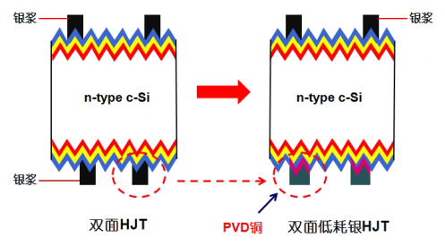 據(jù)悉,低銀耗異質(zhì)結(jié)技術(shù)采用背面PVD鍍銅層,是金石能源的一項(xiàng)專利技術(shù)。該技術(shù)與銀銅混合的“銀包銅”工藝完全不同,在材料開(kāi)發(fā)和制作工藝方面,其采用“正面銀漿、背面鍍銅”方案,做到了正面使用低溫銀漿,背面采用PVD鍍銅層技術(shù),僅需保留少量背面細(xì)柵,大幅度減少了銀漿的使用量。電池的低溫銀漿單耗僅為13mg/W,柵線電極成本可降至0.09元/W。