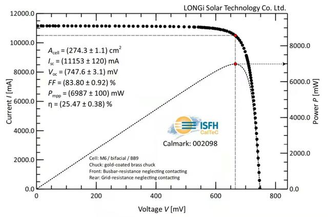 3月29日,經德國哈梅林太陽能研究所(ISFH)認證,隆基采用摻鎵p型硅片制備的硅異質結電池(p-HJT)獲得效率新突破:完全利用可量產工藝在全尺寸(M6尺寸,面積274.3cm)單晶硅片上,創造了轉換效率為25.47%的大尺寸p型光伏電池效率世界紀錄,進一步驗證了低成本異質結量產技術的可行性。