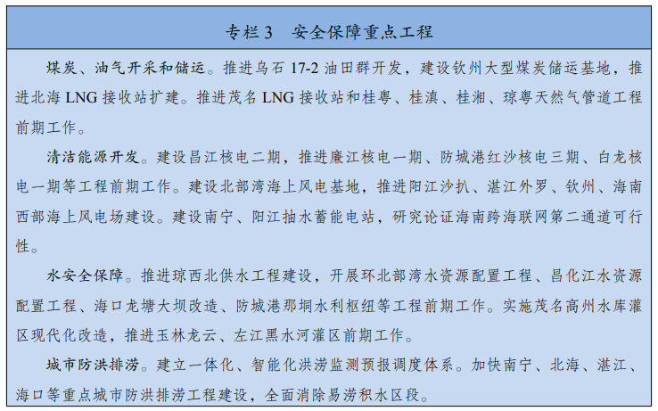 根據《實施方案》,北部灣城市群將開展安全保障重點工程,其中,清潔能源開發方面,將建設昌江核電二期,推進廉江核電一期、防城港紅沙核電三期、白龍核電一期等工程前期工作。建設北部灣海上風電基地,推進陽江沙扒、湛江外羅、欽州、海南西部海上風電場建設。建設南寧、陽江抽水蓄能電站,研究論證海南跨海聯網第二通道可行性。